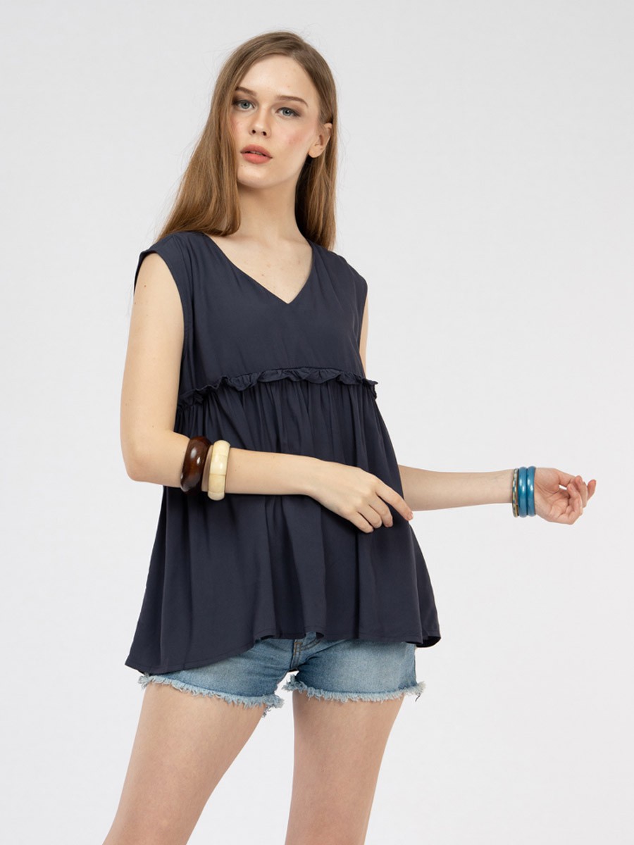 Flared navy sleeveless blouse design on the front empire frill trim.